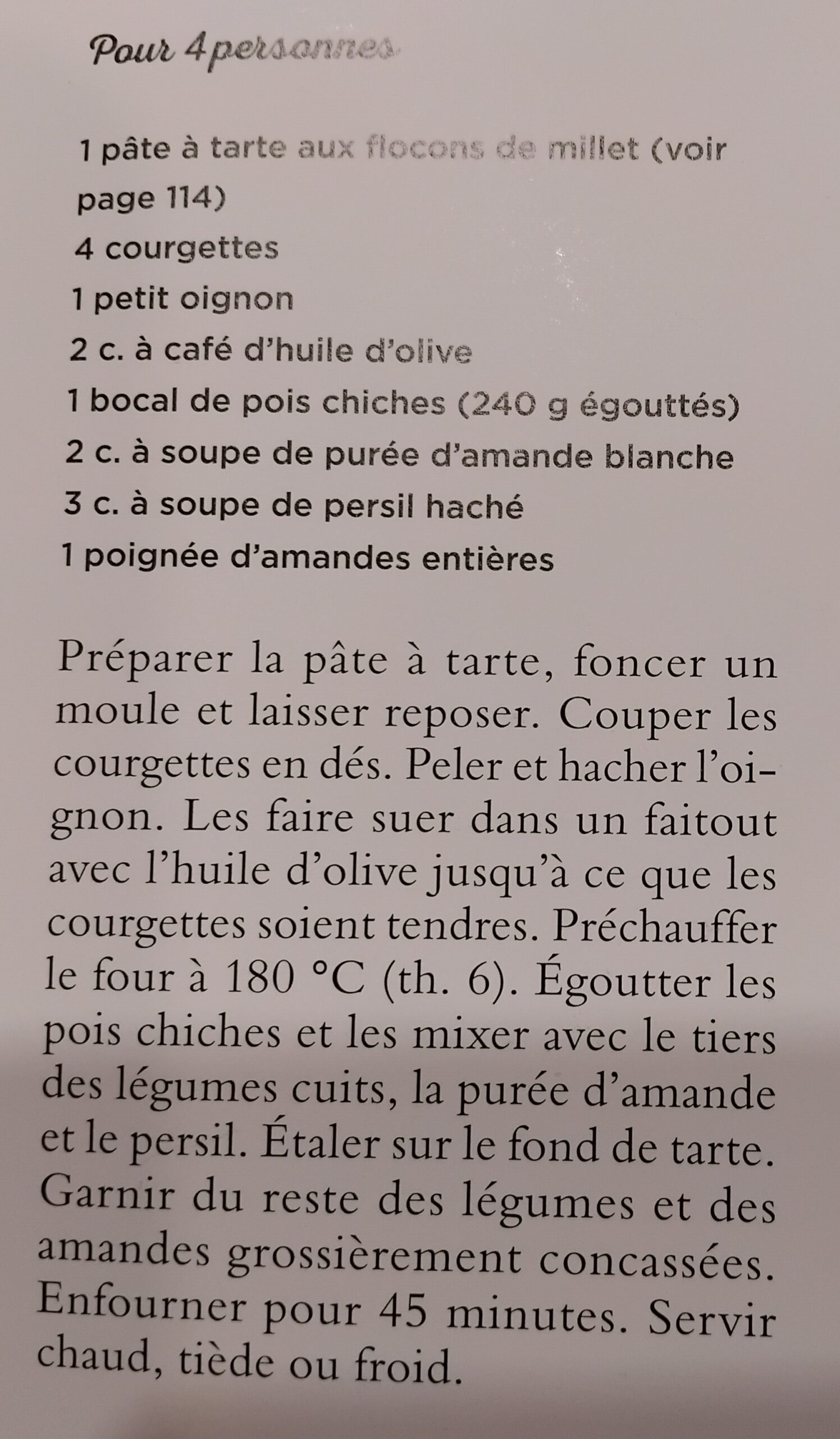 Cf cuisine sans gluten page 177 Ingrédients 1 courgettes 1 verre de millet 1 oignon nouveau 1 c. à soupe d’huile d’olive 2c. à soupe de crème de soja 10 feuilles de menthe 1/8 citron 1 poignée d’amendes entières Préparation Découper la courgette par le milieu et ôter la chair […]