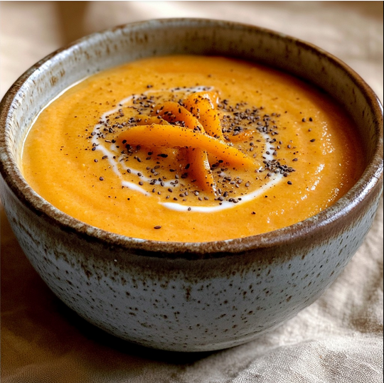 Verse la soupe chaude dans des bols, ajoute un filet de crème, quelques lamelles fines de carotte crue et parsème de graines et de poivre.