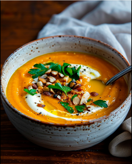 Verse la soupe dans les bols, ajoute un filet de crème, parsème d’amandes concassées, de graines et de persil ciselé.