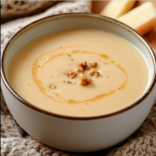 Verse le velouté dans des bols, ajoute un filet d’huile d’olive et parsème de noix concassées.